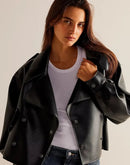 The Alexis Vegan Leather Cropped Trench Coat is designed for both style and comfort. The lightweight material allows for easy layering, while the adjustable belt cinches in at the waist for a flattering fit. Whether you're running errands or heading out for a night on the town, this coat will keep you looking chic and feeling comfortable.