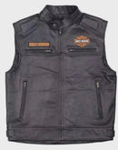 A vest that is both tough and stylish and will never go out of style. The distressed vintage leather used to make this Harley-Davidson Leather Vest for Men is of high quality and will only get better over time. With oversized embroidered graphics, leather inlay, and raw-edge appliqué, it has the look of a typical biker vest. Additionally, the fleece lining of the vest will keep you warm in the cold.